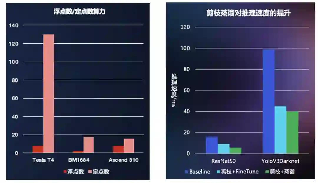 为了让模型跑得更快更省内存,模型压缩就是推理侧非常强大且实用的技术了。这方面,EasyEdge不仅支持了业界领先的量化、剪枝和蒸馏技术,还能够混合使用这几项能力,在尽可能保证效果的同时达到更好的压缩效果。左下图展示了几款常见硬件的定点数算力和浮点数算力的比对,可以看到在很多硬件上定点数算力都远大于浮点数算力,对于这样的硬件,量化是非常必要的。而右图中则可以看到剪枝和蒸馏对于模型推理的加速效果,剪枝和蒸馏本质都是对基础模型在尽量不影响精度的前提下进行精简,自然模型小了,内存占用就少了,推理时间也就短了。
