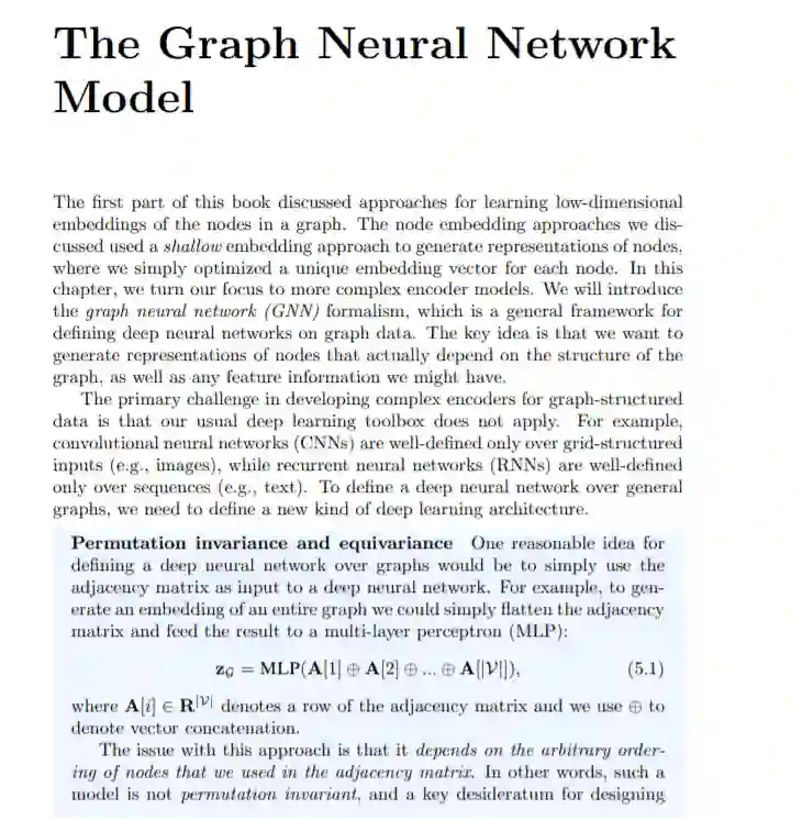 在本章中,我们将关注更复杂的编码器模型。我们将介绍图神经网络(GNN)的形式,它是定义图数据上的深度神经网络的一般框架。关键思想是,我们想要生成实际上依赖于图结构的节点的表示,以及我们可能拥有的任何特征信息。在开发复杂的图结构数据编码器的主要挑战是,我们通常的深度学习工具箱不适用。例如,卷积神经网络(CNNs)只在网格结构的输入(如图像)上定义良好,而递归神经网络(RNNs)只在序列(如文本)上定义良好。要在一般图上定义深度神经网络,我们需要定义一种新的深度学习架构。