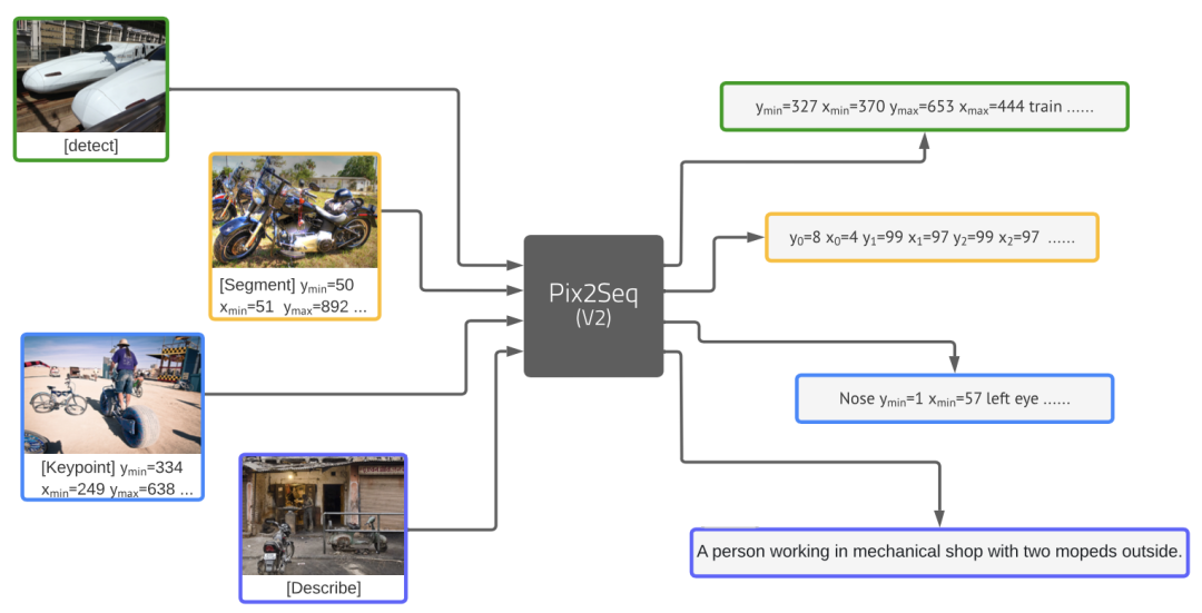 去年Google Brain提出的Pix2Seq就以目标检测作为出发点,建立Pixel-to-Sequence的映射,探索了这种可能性(戳《图灵奖大佬+谷歌团队,为通用人工智能背书!CV 任务也能用 LM 建模!》)。