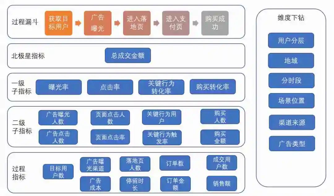 基于这两个原则,以广告曝光过程为例,在这个过程中我们可以用广告曝光渠道、广告成本等指标来描述该过程。同样的,像停留时长、用户数、各环节转化率等指标在每一个过程中都会存在。