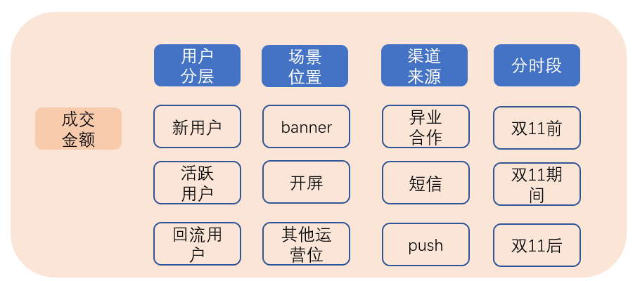 我们这里对于成交金额可以用用户分层、场景位置、渠道来源、分时段来描述该特征。
