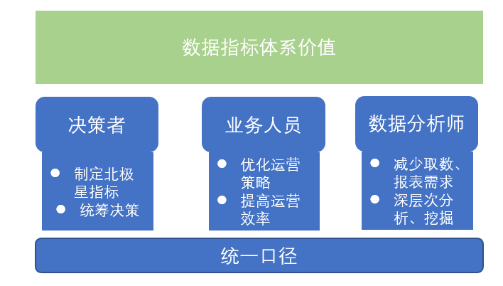 第四,统一口径。数据口径无论在哪个公司都是一个老大难问题。如果我们有一个完善的数据指标体系,并对每个指标的口径进行存档说明,我们就可以对指标进行统一管理,输出正确的口径,并根据业务发展不断完善。