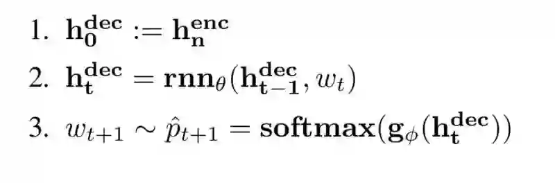 解码器当中生成的回复,不过目前表达为公式而非单词形式。在这里,w_t 为时间步长 t 上的采样单词 ; theta 为解码器参数,phi 为密集层参数,g 代表密集层,p-hat 则为时间步长 t 条件下的词汇概率分布。