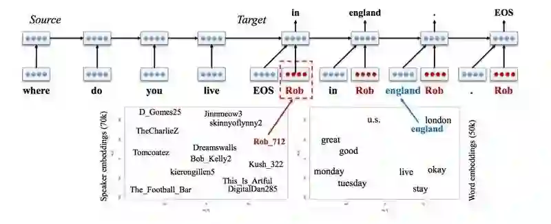 目前最引人关注的处理方式在于“基于角色的神经对话模型”。作者为每段发言赋予对话者身份,并借此生成答案——其中不仅考虑到编码器状态,同时亦引入对话者嵌入因素。而对话者嵌入会在初始阶段即与模型本身一同进行学习。