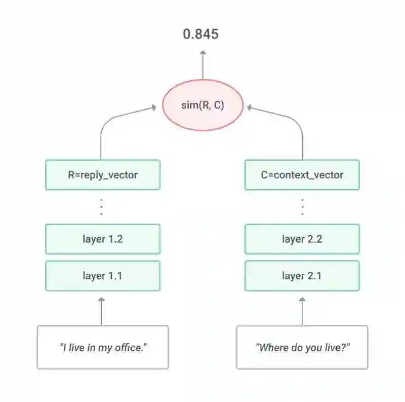 选择式(或称为排名式,或 dssm)网络由两项“塔式”因素组成:其一为情景,其二为回复。每项塔式因素都可能拥有您所需要的架构。塔式因素提取输入内容并将其嵌入至语义向量空间(示意图中的 R 与 C 向量)内。接下来,其计算情景与回复向量间的相似性,即使用余弦相似度公式