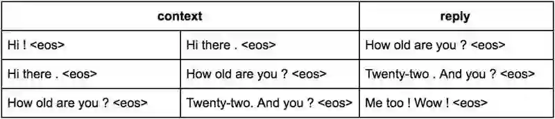 在深入探讨之前,我们首先需要聊聊对话数据集的表现形式。以下提到的全部模型皆进行配对训练(情境与回复)。其中的情景表现为回复之前的数个句子(也可能是单个句子)。该语句被视为从词汇中所获得的一条标记序列。