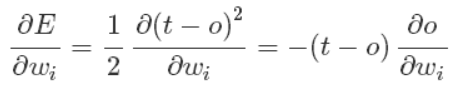 上面公式中的误差是针对于所有训练样本而得到的,而随机梯度下降的思想是根据每个单独的训练样本来更新权值,这样我们上面的梯度公式就变成了:
