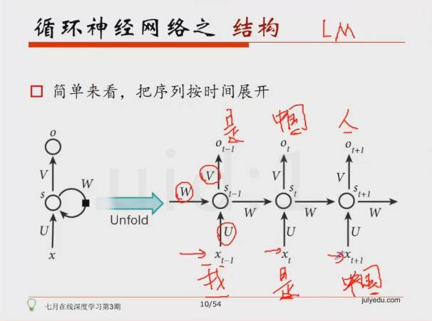 上图将循环神经网络进行展开成一个全神经网络。例如,对一个包含5个单词的语句,那么展开的网络便是一个五层的神经网络,每一层代表一个单词。对于该网络的计算过程如下: