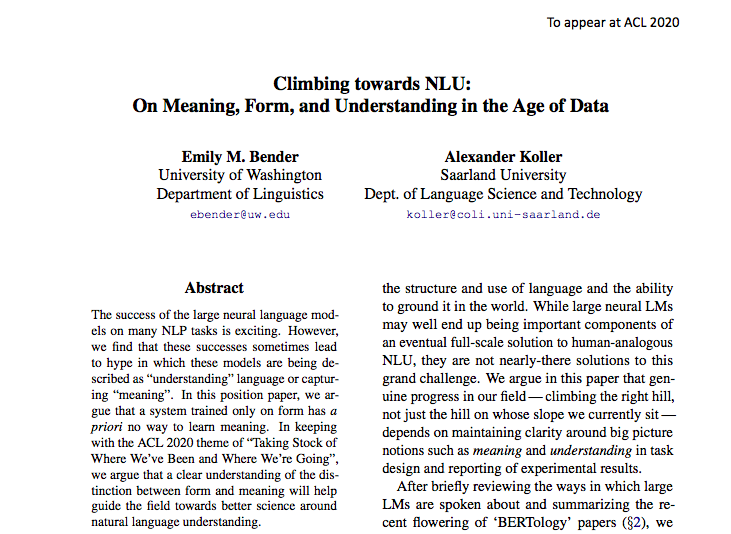 最佳主题论文:Climbing towards NLU: On Meaning, Form, and Understanding in the Age of Data