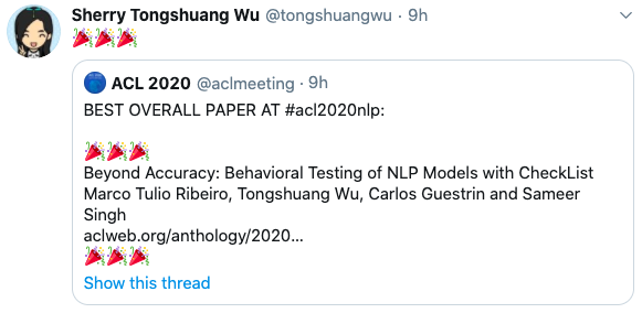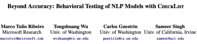 最佳论文:Beyond Accuracy: Behavioral Testing of NLP Models with CheckList.