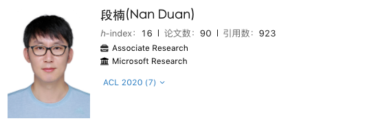 并列第五的是来自于微软研究院的段楠,同样入围7篇论文。