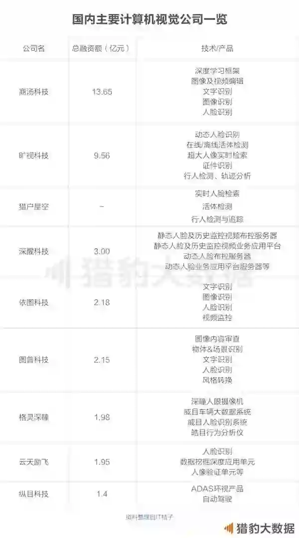 计算机视觉:通过计算机视觉算法及软硬件为客户解决人脸识别、图像识别、视频分析等需求的解决方案提供商。如以下公司↓