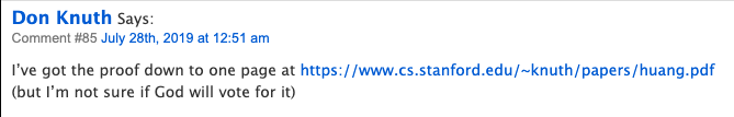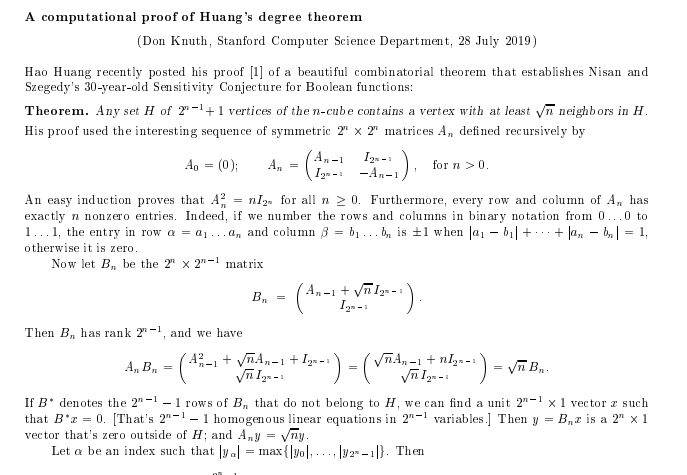 他在文档中 Don Knuth 说道:黄皓最近运用组合学成功地解决了 30 年前由 Nisan 和 Szegedy 提出的布尔函数的敏感度猜想,并指出本证明使 Shalev Ben-David 在 7 月 3 日在 Scott Aaronson 博客上发表的想法具体化。