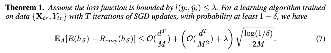 我们对提出的训练方法做了一番理论分析,主要考虑经验风险损失(即部分观测集上的模型预测误差)与期望风险损失(即整体数据分布上的模型预测误差)关于算法随机性的期望差值。这一差值的上界可以由以下定理给出,结论就是泛化误差上界主要与输入特征维度