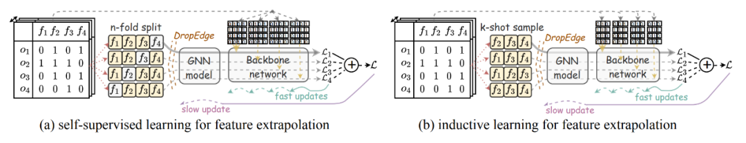 事实上,当我们利用输入数据将样本与特征表示在一张图上后,通过图结构我们就能得到样本-特征以及特征-特征之间的关系。这里特征-特征的关系由样本作为中间节点,也就是图上的二阶相邻信息给出。基于此,图的建立为我们提供了天然的已观测特征与未观测特征的联系。当模型完成训练后,我们可以得到已观测特征的表示embedding,而后对于在测试阶段引入的新特征,我们就可以利用图结构做信息传递,把已观测特征的embedding信息通过图神经网络计算新特征的embedding,从而实现特征的外推。