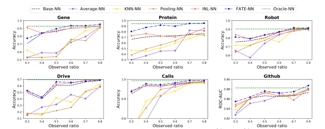 对比以下方法:1)Base-NN只用观测特征训练和测试;2)Oracle-NN:使用全部特征训练和测试;3)Average-NN/KNN-NN/Pooling-NN:使用average pooling聚合所有特征embedding/KNN聚合相近特征embedding/不含参数的mean pooling GCN聚合相邻特征embedding来推断新特征的embedding;4)INL-NN先在仅有观测特征的训练数据上训练到饱和再在新特征上局部更新。在6个小数据集上,考虑不同的观测特征比例(从30%到80%),对比结果如下(图中FATE为本文提出的方法)。