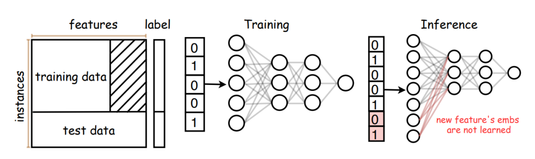 目前的大多数机器学习任务,通常假设训练数据与测试数据共享一个特征空间。然而在实际场景中,训练好的模型通常需要与一个开放环境进行交互,测试集中就会出现新的特征。例如推荐系统中利用用户的年龄、职业等特征训练好了一个推荐模型,后来公司新发布了某个应用,收集到了新的用户数据,这就需要用新的用户特征进行决策。