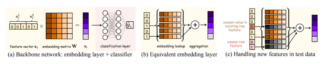 可以分解为两个级联的子模块,分别是特征embedding层和classifier层(如下图(a)所示)。这里的embedding层可以视为一个特征embedding字典,每一行是一个特征的embedding,它对输入向量