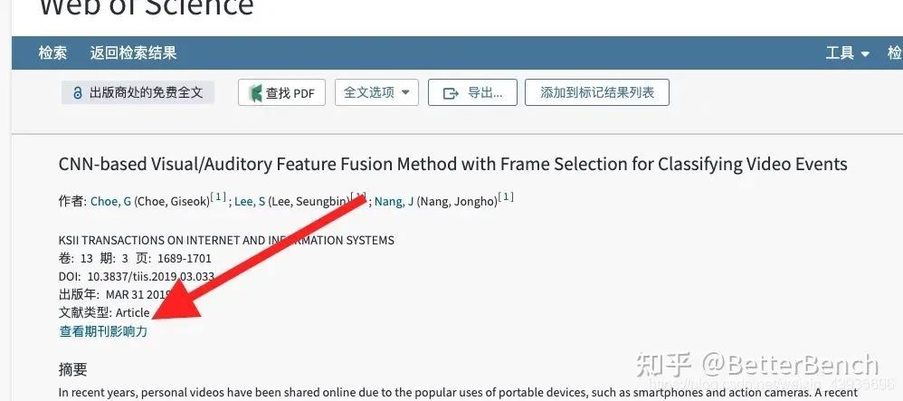 (1)校园网登录Web of science。搜索论文英文名称。找到论文,点击“查看期刊影响力”