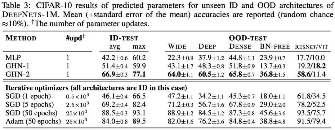 对于CIFAR-10图像数据集,GHN-2在分布式架构上的平均准确率达到66.9%,使用2500次SGD迭代训练的网络所达到的平均准确率为69.2%。对于分布外架构,GHN-2的表现出奇的好,达到了60%左右的准确率。特别是,它在ResNet-50上实现了58.6%的准确率,这个结果相当好。