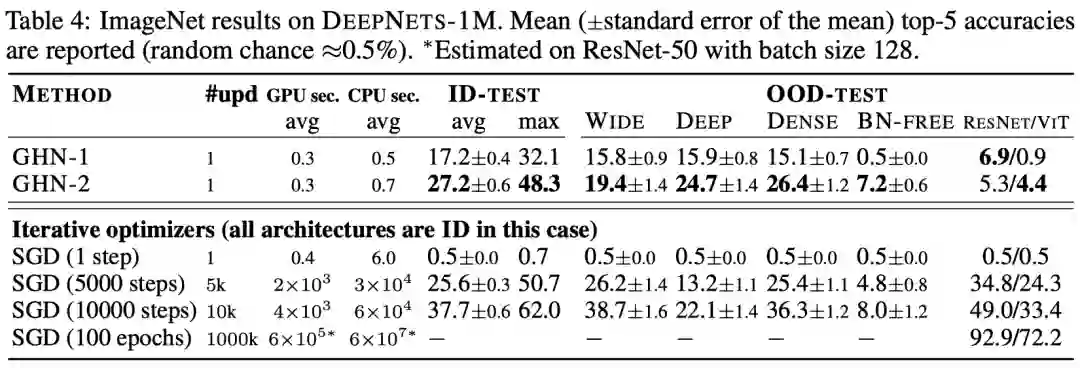 然而,GHN-2在ImageNet上表现不佳。平均来说,GHN-2的准确率只有27.2%左右。但就算是这样,这个准确率和使用SGD训练5000步的相同网络的准确率相比还是有优势的,后者只有 25.6%(当然,如果不计成本地一直执行SGD,最终可以获得95%的准确率)。