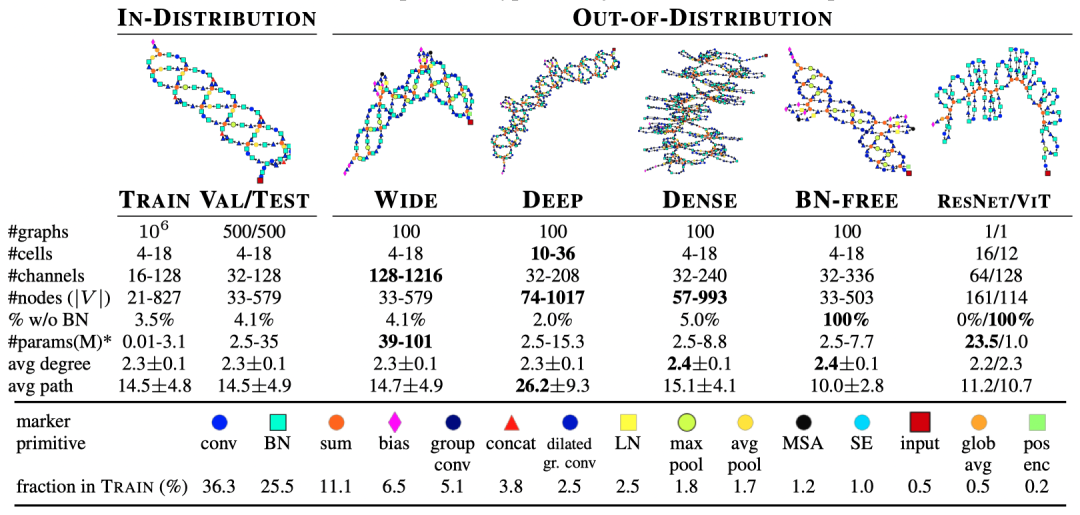 在前一种情况下,目标架构被称作分布式架构;后一种情况,被称作分布外架构。深度神经网络在对分布外架构进行预测的时候经常会失败,因此在此类数据上测试GHN-2非常重要。
