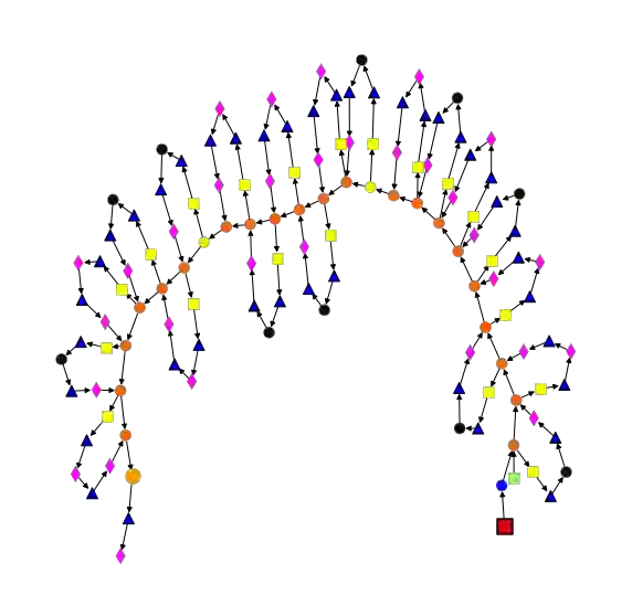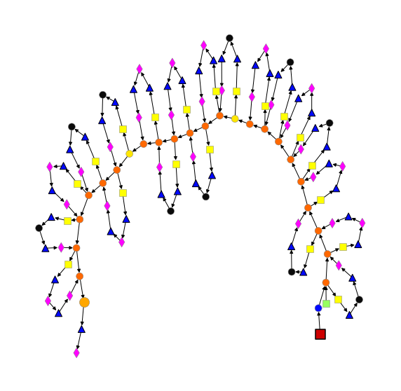 在可视化的图中,一个节点是15个基元中的一个,用底部的标记进行编码,它们在训练集中按频率排序。出于可视化的目的,一个蓝色的三角形标记将1×1卷积(相当于全连接层)与其他卷积区分开来,但其原始类型仍然只是卷积。