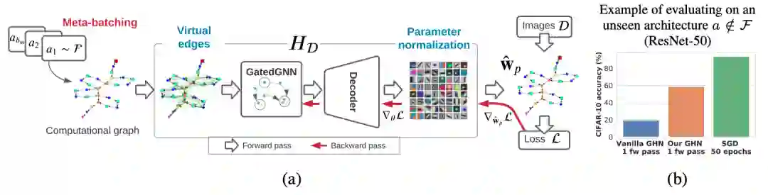 论文提出的方法首先随机抽取神经网络架构,形成一个GHN;在图传播之后,GHN中的每个节点都产生了自己的权重参数;然后,对GHN进行训练,以最小化具有生成权重的采样网络的训练损失;最后,根据使用GHN生成的权重的性能,对随机网络进行排名,并选择表现最好的。