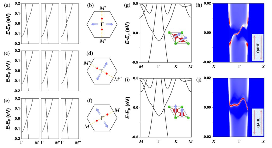 图5. (a) - (f) 面内磁矩沿特定角度形成的半金属相;(g) - (j) 面内磁矩沿其它角度形成的相反陈数的量子反常霍尔效应 [PRL 121, 246401 (2018)]。