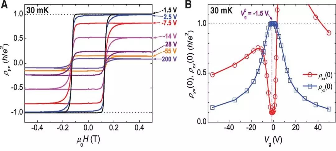 图3. (A) 不同栅压下霍尔电阻随磁场的变化;(B) 零场下霍尔电阻和纵向电阻随偏压的变化[Science 340, 167 (2013)]。