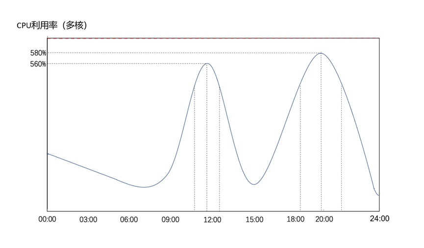 小王首先检查公司已上云的典型业务的算力特征。由于公司业务偏计算型,所以他选择通过常见性能指标 CPU 利用率来观察算力消耗情况,发现公司业务常在中午 12 点左右和晚上 8 点左右迎来算力消耗高峰。