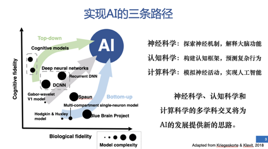 刘嘉教授提到,从传统上讲,我们实现AI一般有三条路径:1)神经科学:自底向上,模仿生物;2)认知科学:自顶向下,构建认知框架;3)计算科学:模拟神经活动(例如DNN)。