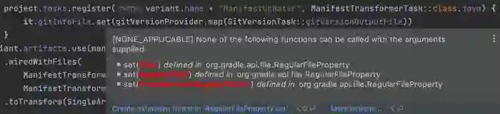 我会从注册 ManifestTransformerTask 开始。此 Task 依赖 gitVersionOutput 文件,而该文件是前一个 Task 的输出。我将通过使用 Provider 来访问这一 Property。