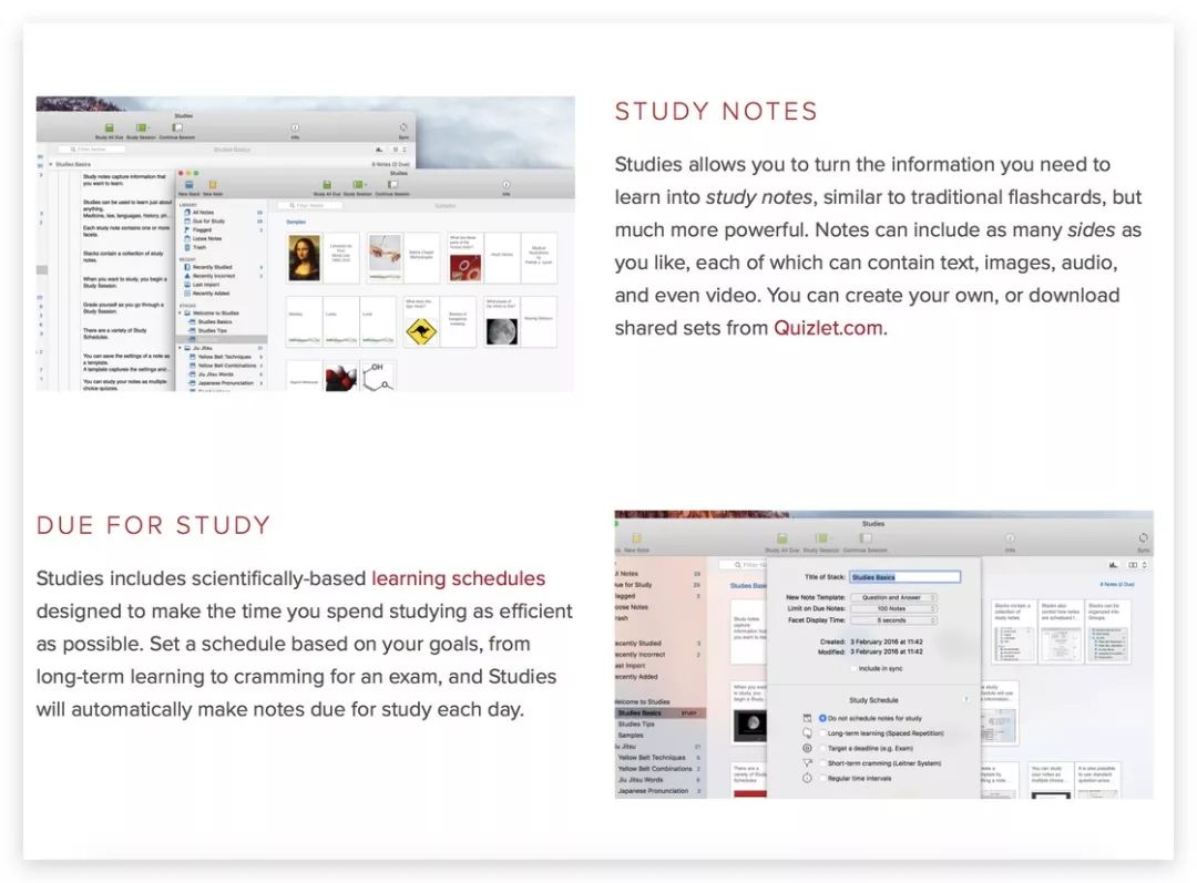 Studies 是一款能帮你提高记忆效率的工具。你可以把公式、文字、图片、日期等等需要记忆的内容放到 Studies 里进行高效记忆,特别适合医学、法律、历史等专业的学生。