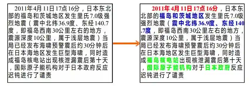 下面是一个例子,从2011年的7级地震,相信不少人还记忆犹新,尤其是他的福岛核电站,那些年我们还抢过紫菜来着对吧。将一条新闻中的重点信息进行抽取和结构化,形成下面的形式,就是信息抽取。