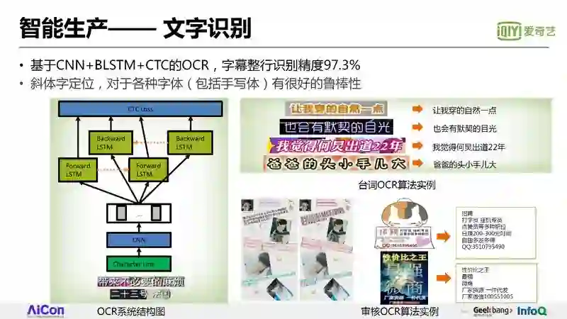 接下来是 AI 在生产流程里的应用。首先是是智能拆条,视频进来之后,把片头、片尾和广告去掉,其次是标注,就像把所有的商品打上标签一样,根据这个标签进行推荐和搜索。然后是审核,过滤盗版、情色等内容。最后是播放处理,比如自动生成封面和动态海报图,帮助对剪辑不熟悉的自媒体用户选取魅力封面图,也提高了海量视频的分发效率。目前爱奇艺首屏的每一栏目左上角都有动态的海报图,AI 会把视频的精彩的片段识别出来进行播放,帮助用户更好地选择视频内容。