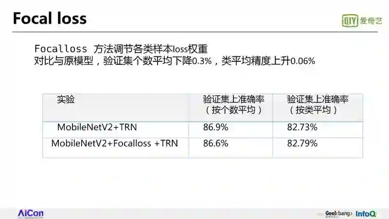 对于小样本和易错分的类别,Focal loss 是不是很有用,我们也做了实验。第一行表示没用 Focal loss,第二行是用 Focal loss,按个数平均的精度没提高,反而降了 0.3%,但是按类平均精度提高了 0.06%, 所以说 Focal loss 调整能力对解决这个问题效果很有限,仅微小的提高了分类器的推广性能。