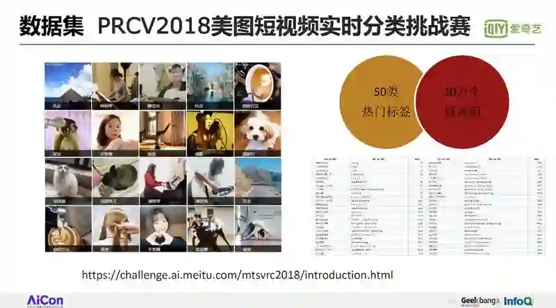 最后是美图短时频分类 mtsvrc2018 数据集,是 UGC 短视频实际应用非常有代表性的数据集,有 50 个类,10 万个短视频,50 个标签。下面我们将在 mtsvrc2018 数据集上,进行短视频分类方向的数据分析、实验比较。在 mtsvrc2018 数据集上,实验的评价指标,第一个是精度要高,第二个,速度要快。最终评论指标看提交的算法性能点和蓝色参考点的距离长短,越靠近蓝色原点,表示性能越好。