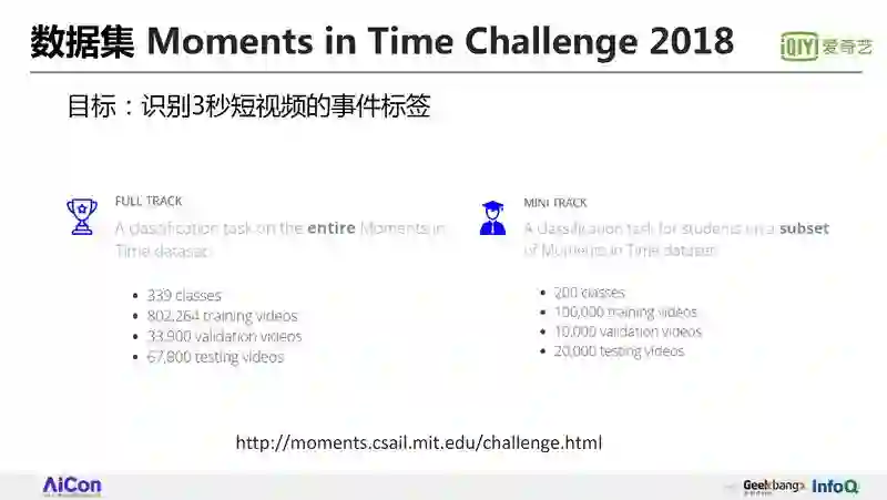 第二个数据集 Moments in Time,这个数据集有 339 个类别,每条视频 3 秒左右。短时长有什么好处?可以方便大家训练,时间长的问题就是数据量大,而且长视频标签,不一定能充满整个视频片段,会带来一些噪音片段。
