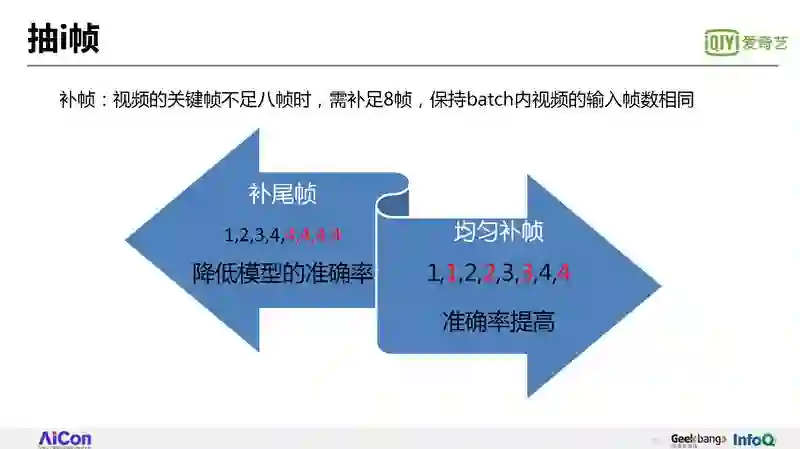 首先就是抽帧,每个视频里关键帧 i 帧这个数目是不同的,我们也画了个分布。比如说如果一个视频只有四帧,我们如何取八帧,怎么再凑足这个八帧。有两个方法,第一个办法是再补尾帧,后面重复实现。还有一个办法是均匀插帧,11,22,33,把红色的帧插进去。经评测,均匀补帧比插尾帧效果好很多,因为插尾帧的时候,相当于把最后第四帧插了很多帧无效的信息。如果第四帧是黑帧,或者是无意义的帧,它会带来负面的影响。