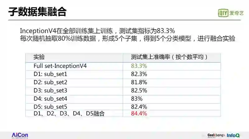 下面介绍基于多个子数据集的融合实验和基于多个卷积网络结构的融合实验。我们采用了融合的办法,第一个就是数据集融合。把一个数据集随机抽了 5 份。在测试集上,每个模型比验证集的精度还低,因为它的分布是不一致的。在测试集上,精度大概在 82%-83% 之间,经过把这 5 个数据集训练得到的 5 个分类模型进行融合,准确率为 84.4%,这个子数据集融合方案可以把精度提高 1%。