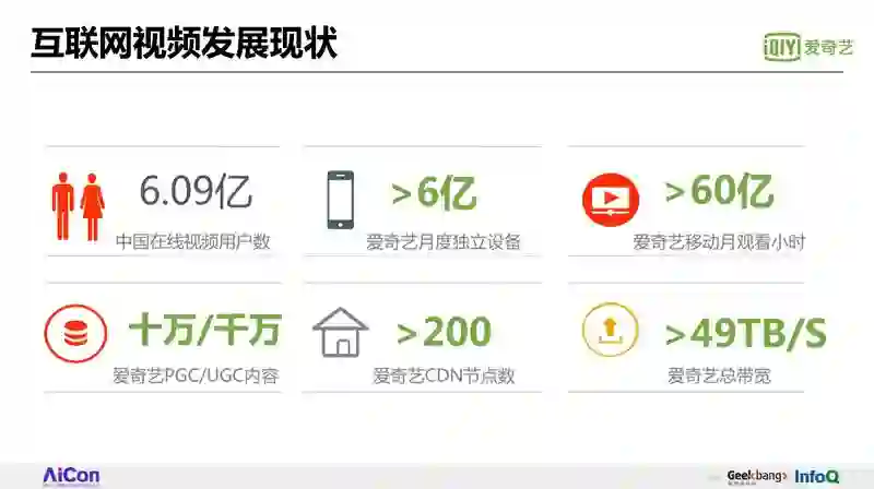 首先,互联网视频行业的用户和数据量正在飞速增长。中国在线视频用户超过 6 亿,占全国互联网用户的 75%。仅在爱奇艺视频平台,用户月观看时长超过 60 亿小时,接近甚至超过了美国 Youtube 的观看时长。爱奇艺有十几万部 PGC 专业影视剧,千万级的 UGC 用户生成短视频,视频数据量巨大。此外,传递视频的网络带宽巨大,爱奇艺的总带宽达到 49TB。海量用户、视频和带宽,对我们的工作带来巨大的挑战,必须要借助 AI 进行有效的分析处理,才能够提高用户体验和生产运营效率。