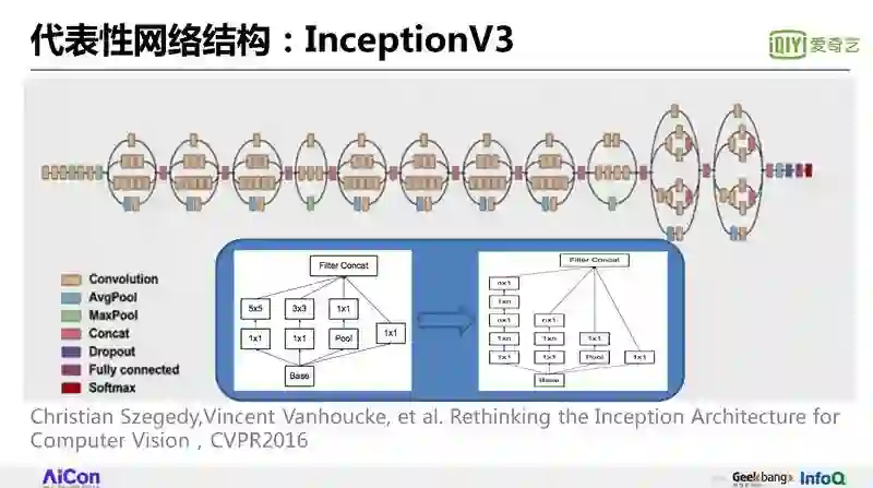 深度学习最重要的功能是分类器。比较有代表性的像 Inception Model V3 模型,具有非常好的图片分类性能,谷歌推出的 Youtube8M 视频竞赛数据集用的就是 InceptionV3 模型提取的图像特征。Inception Model 有 V1、V2、V3 和 V4 版本,V1 首次使用了 Inception 概念。它类似于电影《盗梦空间》中一层层的深入空间,当你进入一层梦境时,还有更深入的一层空间,再进去可能还有更深一层的世界。深度学习本来是个网络模型,进到每层节点后,节点内又是个展开的网络。它就相当于把一个网络节点变为网中网,里面横向用很多组卷积滤波器,纵向有好几层组成,让这个网络更加有宽度,更加有深度。V2 版在卷积后做了一个 batch Normalization 归一化,避免梯度消失的问题。V3 版把 5×5 的卷积分解成若干个卷积,比如 V2 版的两个 3×3 卷积,到 V3 变成 3×1 和 1×3 两个卷积来代替 1 个 5×5 的卷积。它的好处是减少参数并提高计算速度。参数少就好小样本学习,层数多更利于提取出高层语义特征。