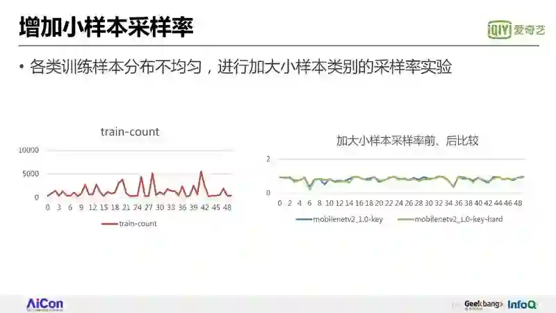 增加样本数目,可以提高分类精度。但在给定的数据集上调整样本采样率,能否提高精度?左图画了一个样本的分布,样本最多的类别有五千个,最低大约三百个样本。对小样本类别提高采样率,使每类有相同数目的样本进行训练。右图的实验表明增加小样本采样率,没有性能改进。即使通过线性内插方法生成更多的样本,因为没有增加信息量扩大样本特征空间范围,性能也不会提高。