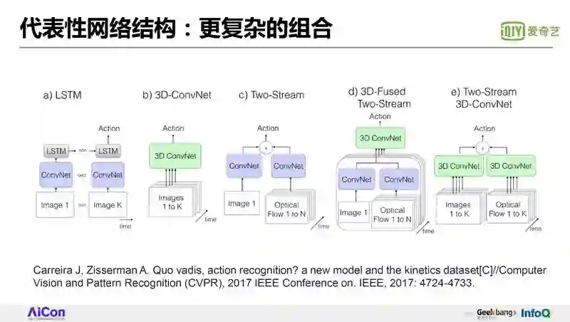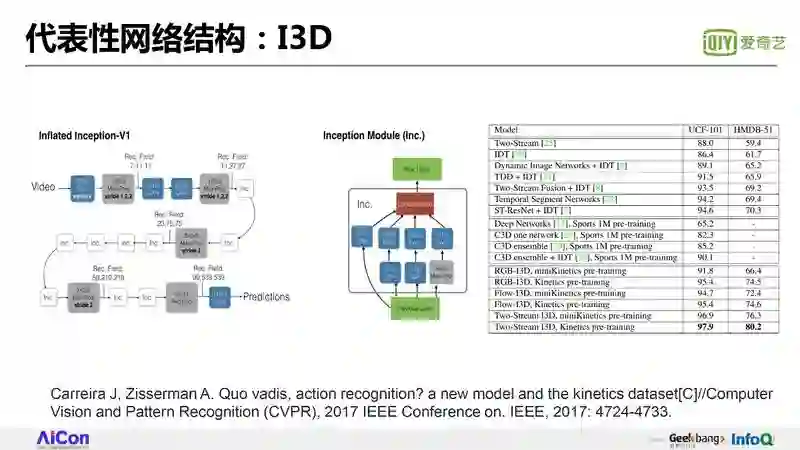 还有 I3D 模型,整个网络中的某一个模块,把 Inc. 的模块用中间这张图的 Inception 结构塞进去,从而把这个网变得更宽更深。