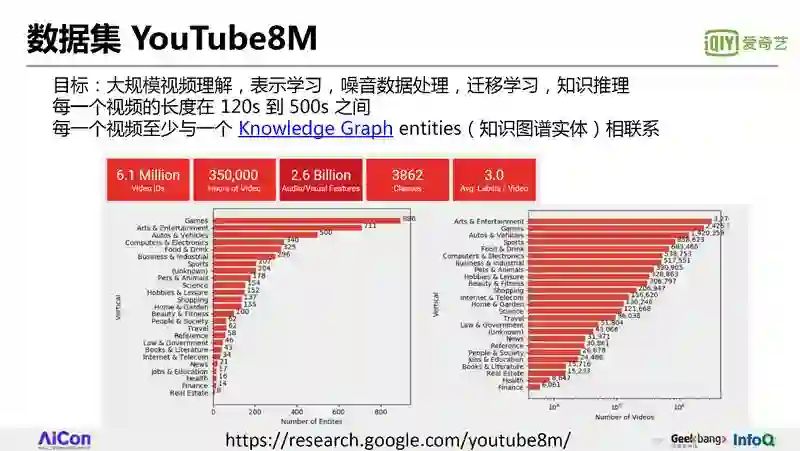 首先介绍视频分类的几个重要数据集。这些数据集大部分是公开的,大家都可以用。第一个数据集是谷歌 YouTube8M,数据量百万级非常大,视频长度 2 分钟到 6 分钟左右,有 3800 多个类别,大家可以尝试一下。