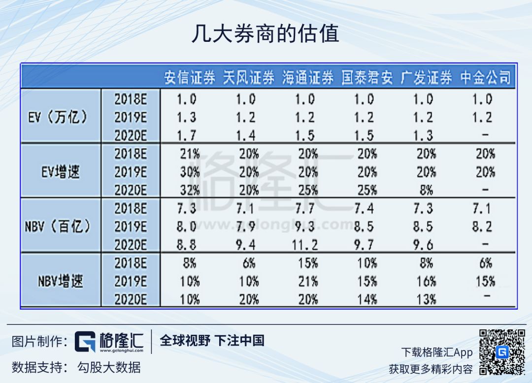 业绩增速方面。从数据上看,市场对平安2018年、2019年全年的增速依然给予不错的预计结果。其中内含价值的增速判断较为一致,预计未来两年增速保持20%。而在寿险的核心指标新业务价值方面,多家券商平均预期增速能2018年能回到8%,2019年能超过10%。