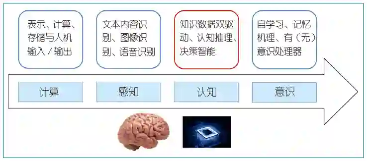 大规模常识知识库与基于认知的逻辑推理是人工智能发展面临的瓶颈问题。1968 年,ACM 图灵奖获得者爱德华·费根鲍姆(Edward Feigenbaum)研发出世界首个专家系统 DENDRAL,并随后在第五届国际人工智能会议上提出,将知识融入计算机系统才能解决只有特定领域专家才能完成的复杂问题;1999 年,万维网之父、ACM 图灵奖获得者蒂姆·伯纳斯-李(Tim Berners-Lee)爵士提出了语义网(Semantic Web)的概念,其核心理念是用知识表示互联网,建立常识知识库;2019 年,ACM 图灵奖获得者约书亚·本吉奥(Yoshua Bengio)在 NeurIPS 大会上的主题报告中指出,深度学习应该以感知为主向,向基于认知的逻辑推理和知识表达的方向发展,这个思想和清华大学张钹院士近期提出的第三代人工智能思路不谋而合。总的来说,人工智能的发展经历了从表示、计算到感知两个阶段,下一个阶段的核心是认知(见图 1)。近期,另一位 ACM 图灵奖获得者曼纽尔·布卢姆(Manuel Blum)夫妇提出了意识 AI(意识智能)的思想,这是一个既经典又全新的概念和思路,核心理念就是构造一个新型的可用数学建模、可计算的机器认知/意识模型。