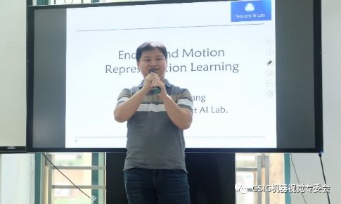 随后,来自腾讯AI Lab的黄文炳博士为同学们作了题为“端到端视频表示学习”的学术报告。黄博士介绍了图像分类和动作识别在深度学习推动下的革命性发展,并基于当前光流方法中存在的显著缺陷,提出了一种全新的可端到端训练的神经网络——TVNet。TVNet通过模仿和展开TV-L的迭代优化过程而获得,无需任何额外训练就能直接使用,实现了比所有同类方法更优的准确度。