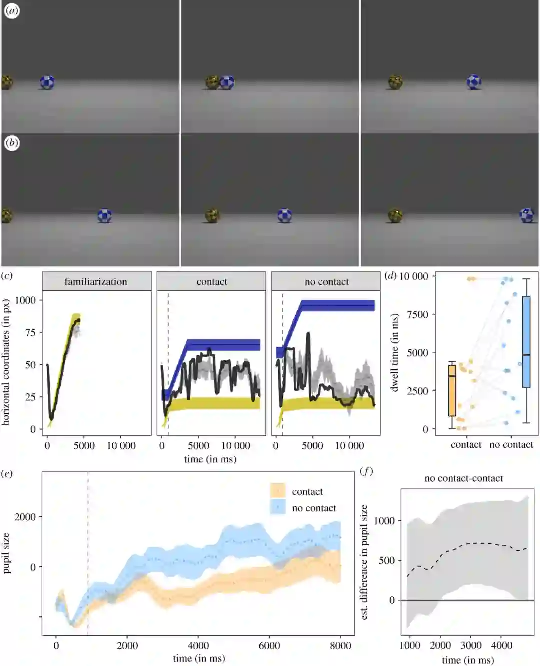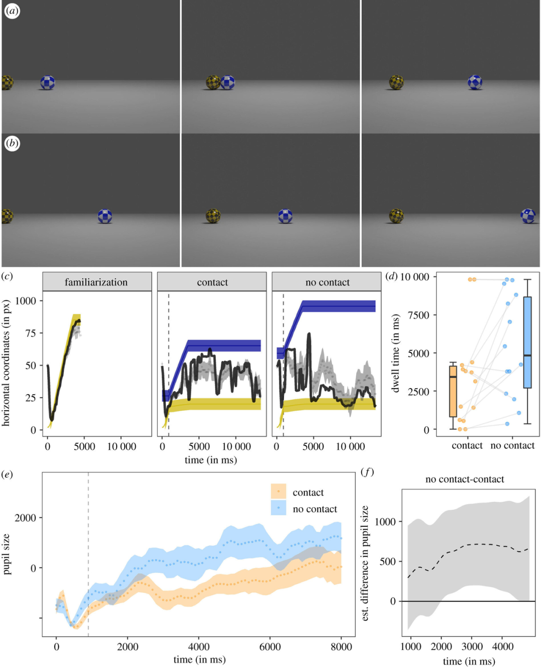 具体来说,在试验过程中,研究人员训练了 14 只成年边境牧羊犬,将其放在眼动追踪设备上观看动画。这些动画以随机顺序播放,其中有的动画显示一个运动的球撞向静止的球,撞击后第一个球停止另一个球运动。而另一个动画则显示,当一个球还未撞到静止的球时,它就开始自行滚动了,这显然不符合逻辑。